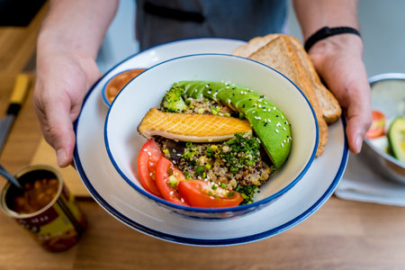 hand holding a quinoa bowl with grilled veggies, created with generative ai