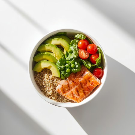 A vibrant salmon bowl featuring fresh avocado, cherry tomatoes, green peas, and quinoa, ideal for nutritious meals and healthy eating enthusiasts seeking balance and flavor in their diet.