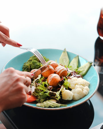 Top view of hands of a woman eating a vegan healthy dish