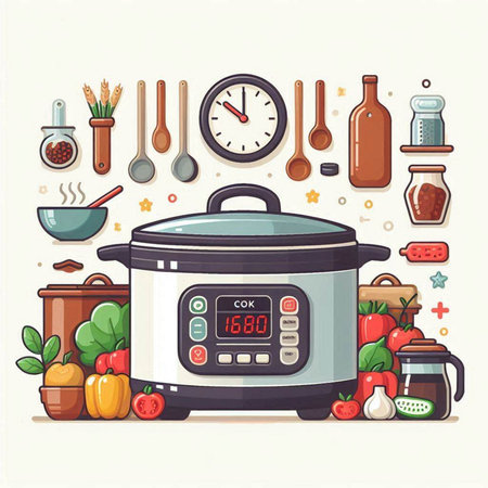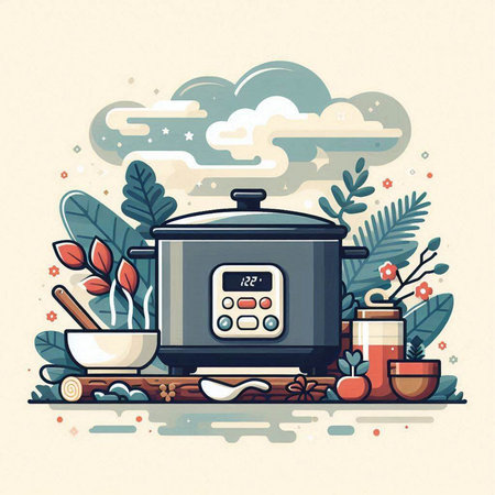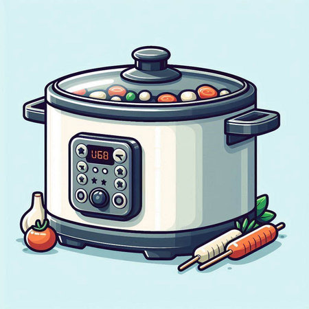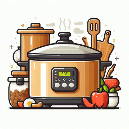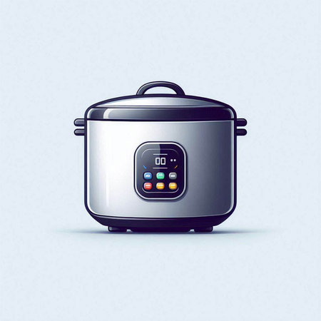 Vector illustration of a cartoon electric rice cooker with a digital timer.