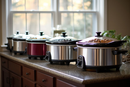 multiple slow cookers lined up, showcasing variety, created with generative ai
