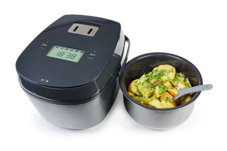 Household electric multi-cooker and potato slices baked in it and sprinkled with chopped parsley and garlic on a white background