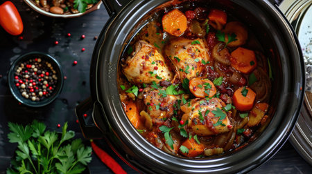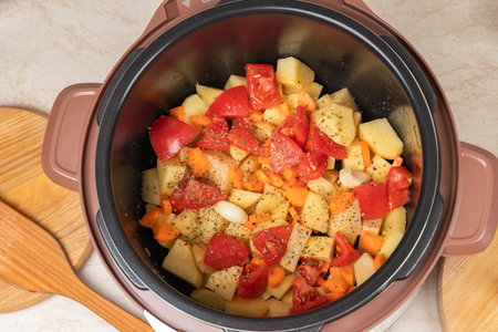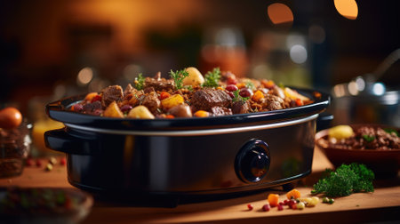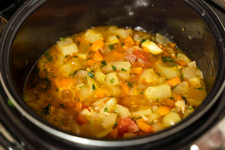 Delicious vegetable stew is prepared in a slow cooker in a home kitchen.