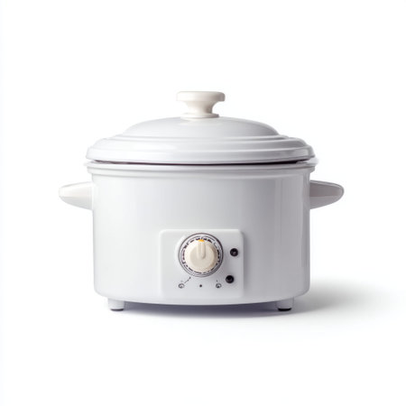 A stylish white slow cooker featuring a round design and simple dial controls, ideal for preparing delicious soups, stews, and hearty meals conveniently at home.