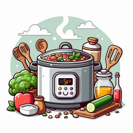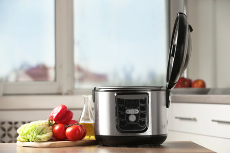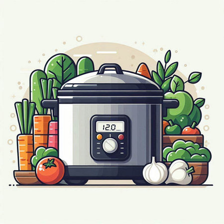 Vector illustration of modern electric multi cooker with vegetables in the background.
