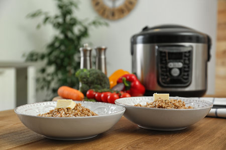 Two with delicious buckwheat and modern multi cooker on wooden plates table