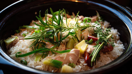 A visually appealing clay pot filled with fluffy rice, tender chicken, and a variety of fresh herbs, showcasing a perfect blend of flavors for a delightful meal.