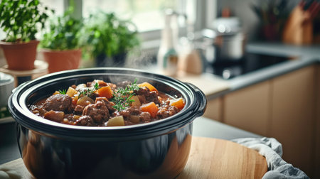 A cozy kitchen scene with a slow cooker on the counter, filled with a hearty stew, highlighting the convenience of slow cooking.