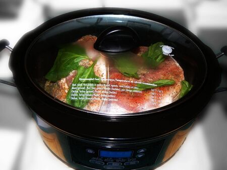 A beautifully arranged slow cooker filled with raw meat and fresh herbs, showcasing a perfect setup for a savory meal. Ideal for culinary inspiration.