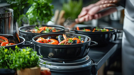 Man skillfully cooks with a modern multi cooker in a sleek kitchen, creating a gourmet meal effortlessly