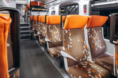 A spacious interior view of a train featuring empty seats, showcasing modern design and a tranquil atmosphere perfect for a travel journey.