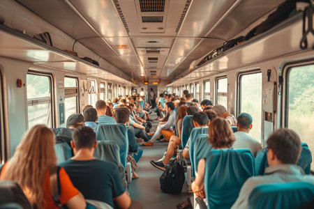 Passengers occupy few seats in a modern train carriage, showcasing a quiet travel moment midday in a city.