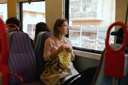 Attractive woman on public transport in knitting work activity using wool. Relaxed woman enjoying their time traveling. DIY and creative activities on a trip concept. Copy space. Part of the series.