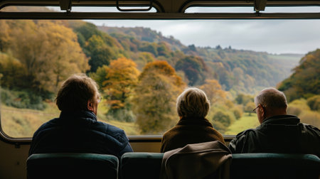 A family enjoying the scenic views from their train compartment as they reminisce about old memories