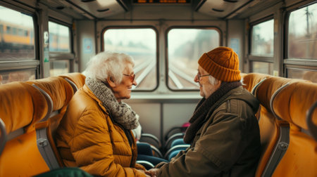 Silverhaired travelers reminiscing about past train adventures and sharing stories with fellow passengers