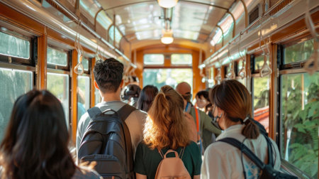 A view of a crowded train carriage that is filled with commuters during a busy journey through the city