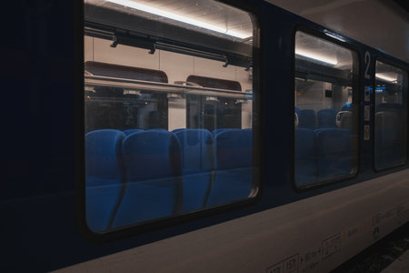 View through the train window showing empty blue seats in a second-class carriage at night in Serbia