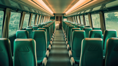 An empty train interior showcasing modern design with spacious seating and soft lighting, perfect for transportation, travel, and commuting visuals.