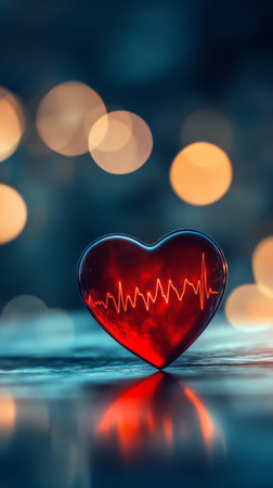 A red heart with an EKG line extending across a dark, reflective surface with bokeh lights.