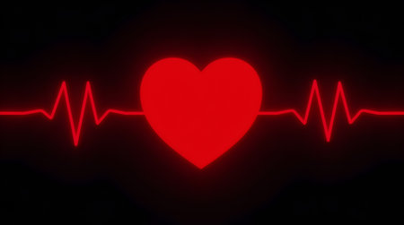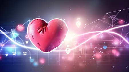 This striking image features a heart symbol on a modern background with a heartbeat line, blending themes of love, health, and technology in a vibrant style.