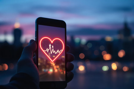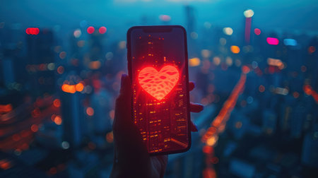 A close-up view displays a smartphone screen featuring a glowing heart symbol, emanating light beams. The composition incorporates a dark background with city lights, suggesting an evening setting. The overall style leans towards a modern, digital aesthetic, suitable for various applications, including advertising and editorial content.