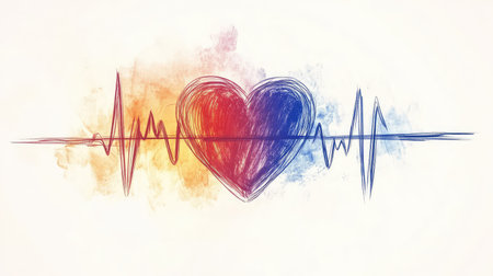 A stylized rendering featuring a vibrant red heart intersected by a bright blue electrocardiogram line, set against a soft, gradient background of blues and pinks.