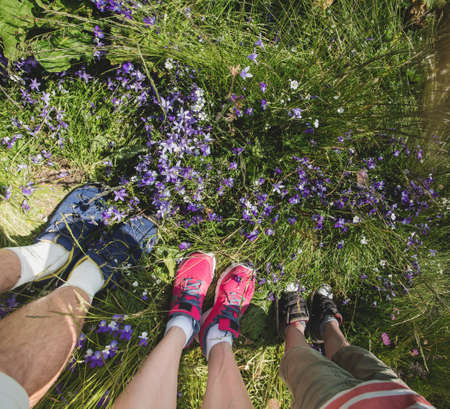 Looking down man and woman in the color sneakers standing on the green grass with cones and tree branches. Couple walking in the summer forest. Local Traveling and relax in nature. Digital detox.