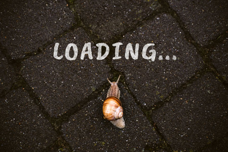 Loading, downloading, slow internet speed concept with word loading and Brown garden snail crawling the road
