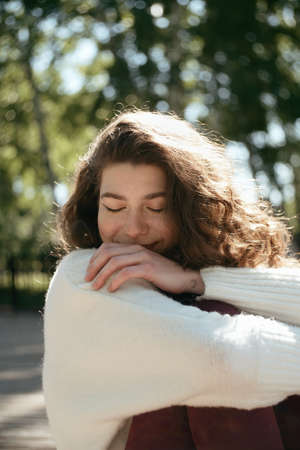 Natural beauty attractive young girl, portrait in a warm sweater in the park in early spring at sunset, sensual alluring look. A young beautiful woman in a white sweater walks alone in a spring park