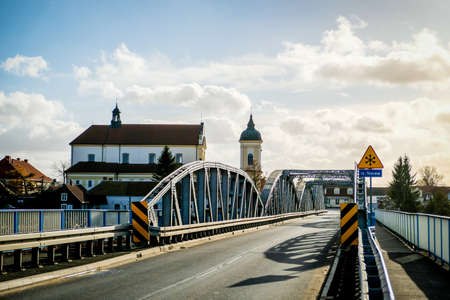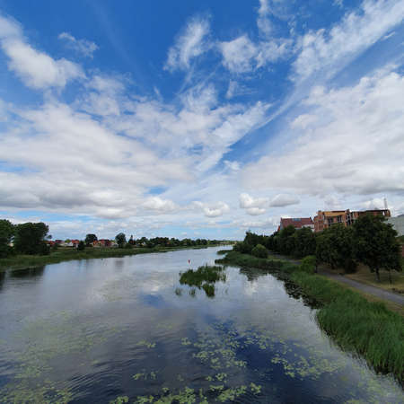 Konin, Poland - July 22, 2017: View on bridge and embankment of Warta river in polish town Konin, Greater Poland province