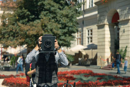man photographer with vintage camera taking photo of tourists in European city center historical district space