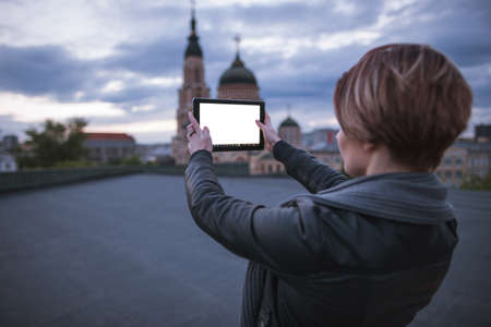 Girl takes pictures of the city on a tablet. Girl takes pictures of the city on a tablet. Tourist near attractions. A traveler uses a digital gadget for photos