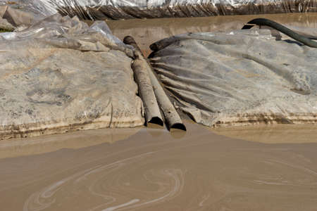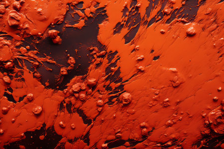 Background of brown mud with bright orange chemicals, environmental pollution, toxic waste hazard, horizontal aspect