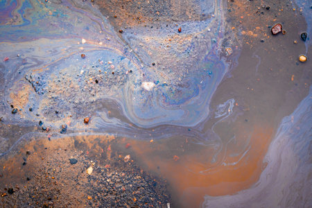 Colorful gasoline stain on the background of polluted water in a puddle. The concept of environmental pollution, oil spills and environmental problems.