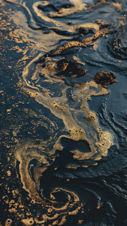 Foam and debris floating on polluted water create abstract shapes, highlighting environmental damage