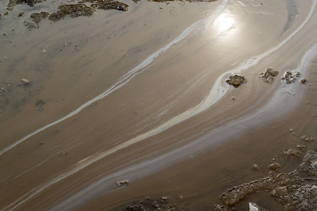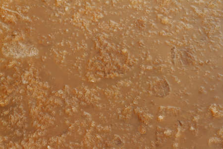 Foamy muddy water of yellowish-brown color. Muddy sea water, puddle, dirty surface Top view.