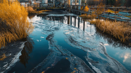 A scenic view of an industrial area showing contaminated water reflecting nearby structures.
