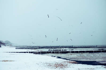 Winter coastal landscape with floating ice. Baltic sea in evening light.
