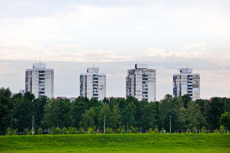 Soviet era block panel houses. Cloudy blue sky, dramatic cloudscape. Panoramic view. Real estate development, architecture, building exterior, construction industry, technology, history, past