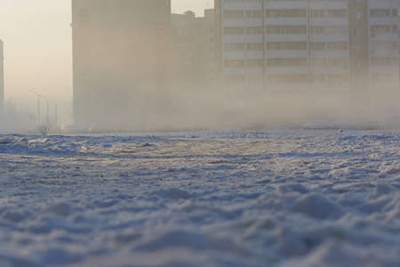 Fog creeps along the ground a frosty winter morning. On the background of houses