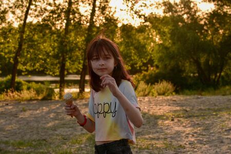 Beautiful little girl eats ice-cream in the summer. girl eating ice cream. 9 years old girl walking in the park
