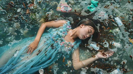 Beautiful girl in blue dress lying in water with trash.