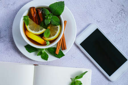 Black and green tea with lemon, cinnamon sticks and mint leaves on table with mobile phone. Social media. Hot drink. Healthy melissa tea natural organic aromatic drink in cup. Summer, Autumn winter warming drink. Stay healthy herbal tea