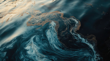 A close-up of oil spills mixing with seawater, creating swirling patterns of dark oil and light water, highlighting the stark contrast.