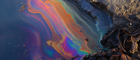 Colorful sheen of an oil slick floating on water's surface. Ecological problem