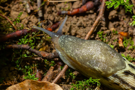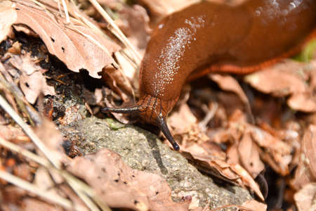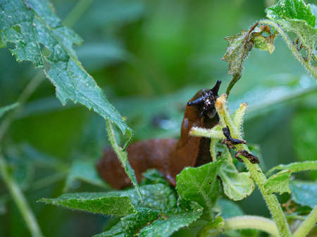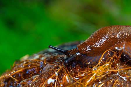 Closeup of of garden slug arion rufus eating