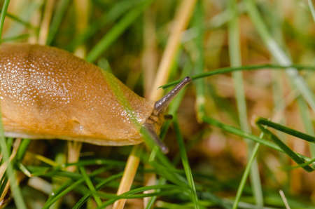 Slug sitting n the grass in Sweden, snail without snack, spanish slug