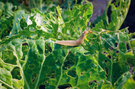 Cabbage leaves eaten by slugs, parasite spoils the harvest.