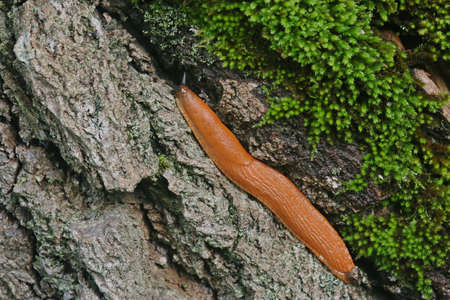 An orange slug crawls up a tree. close-up