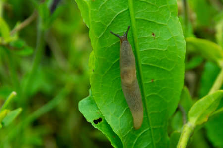 large slug in the garden, in nature, close-up macro, garden pests, crop eaters